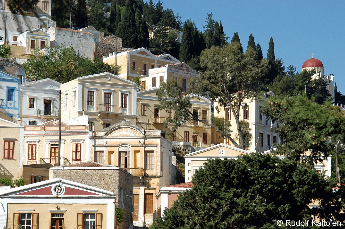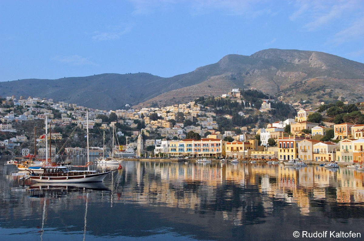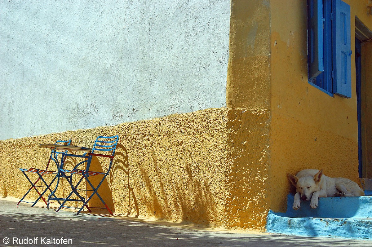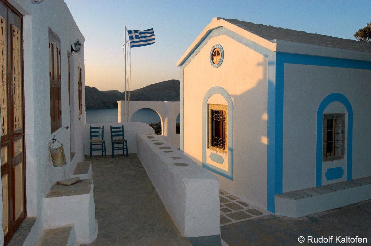 Wenn auch der unter Denkmalschutz stehende Hauptort Sými hauptsächlich von seinen pastellfarbenen Bauwerken lebt, und mit neoklassizistischen Stilelementen überschwenglich bevölkert zu sein scheint, finden sich dennoch zahlreiche Traumbilder vom gefühlten weißblauen Zweiklang der griechischen Inselseligkeit - man muss diese nur aufspüren und in sich vergegenwärtigen. Auch auf Sými finden sich die Nationalfarben der Hellenen nicht nur auf den Flaggen und Fähnchen am Hafen.